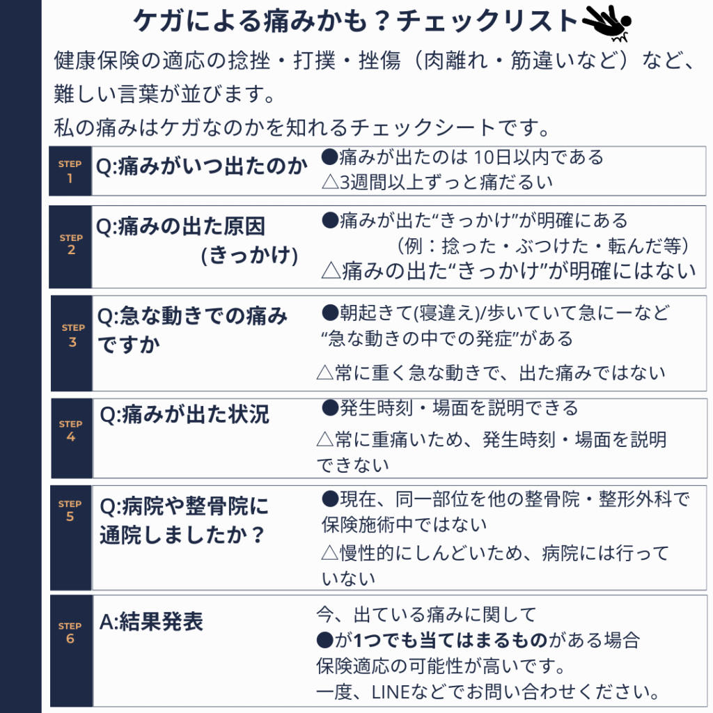 来院の際に、「いつ・どこで・どうして痛めたか」をお伝えいただければスムーズです。