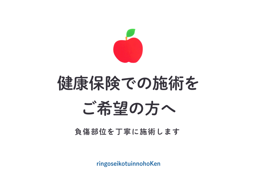 りんご整骨院では、厚生労働省で認められている整骨院が健康保険を使える範囲内で健康保険での施術が認められている急な痛みを誠実に取り扱います。